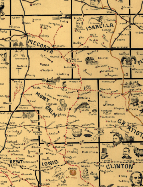 The DL&N extended the Stanton branch to McBride in 1877 and the next year to Blanchard. In July 1880 the branch was completed to Big Rapids, Michigan, where the DL&N made a second connection to the GR&I.