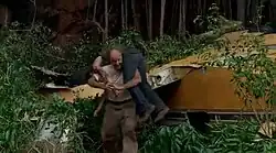 ![]() John Locke carries a severely injured Boone after the Beechcraft plane he was in fell down a cliff | |