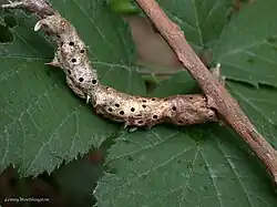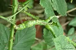 Some herbivorous insects create their own microhabitats by forming an abnormal growth, in this case a gall. Both upright and prostrate stems can be galled and they are often low down and hidden by vegetation. They tend to be most noticeable in the winter when brambles have lost some of their foliage. The gall is an elongate swelling in the stems of brambles; 2–15 cm long and circa 1 cm wide. They are often curved or they cause the stem to bend and can contain up to 200 spherical swellings. Each swelling is a chamber containing a white wasp larva. Larvae overwinter in the gall and adults emerge the following spring. Galls can remain on the plants for many years, are often silvery and numerous exit holes can be seen.[2][3]