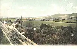 Intermediate stations were to have been provided on the route and a story grew up that the St James' Park, Southampton site in Shirley was excavated for this purpose, often repeated in local books.[8][2] Deposited plans, however, show the park site already existed within the surrounding road layout and was not part of the planned route, which ran to the north east of St James' Church; its current sunken appearance was caused by later gravel extraction.[11] Archival research by the Shirley Local History Group, notably among the records of a local landowner revealed that a later revival of this scheme, the Southampton and Winchester Great Western Junction Railway, intended to use the park as the original route at this location had by then been developed. Plans and sections dated 1901 show the intended route of the railway as passing through the park from East to West.[12] Records indicated that property sales were discussed for this scheme, which would have followed a slightly different route to the previous scheme in some areas without a tunnel at Chilworth. South of St James's Park at this time Didcot, Newbury and Station (now Stratton) Roads were named. Station Road also contained a police station.[13][14] The only physical remnant of the project in Southampton is the tree covered embankment hidden behind current properties east of Hill Lane between Milton Road and Commercial Road. The deposited plans for the route through Southampton[11] and current land levels suggest this was also the location of the viaduct work described by Sands.[15] A photograph described as illustrating the part built viaduct from the London and South Western Railway appears in both the book An Illustrated History of the Didcot, Newbury and Southampton Railway[16] and in a detailed article about the Didcot Newbury and Southampton Railway in Southampton in the Hampshire Industrial Archaeology Society Journal, No. 26 (2018).[9]