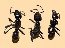 Dinoponera gigantea is one of the world's largest species of ant.[4] The females of the species are larger than males, with lengths ranging from 3 to 4 centimetres (1.2 to 1.6 in).[5] The females are coal-black in color, while the much smaller males are dark red.