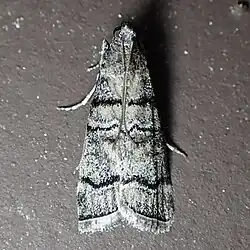 The wingspan is 23–25 mm. The forewings are dark gray, finely peppered with white making the ground color appear dark ash gray. The hindwings are white, with a faint smoky tint towards the apex in females.[2]