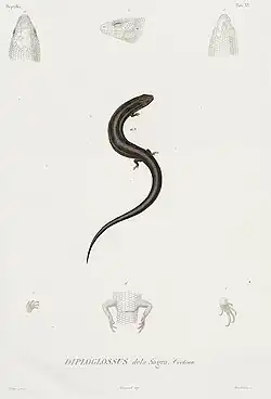 - ^ Beolens, Bo; Watkins, Michael; Grayson, Michael (2011). The Eponym Dictionary of Reptiles. Baltimore: Johns Hopkins University Press. xiii + 296 pp. ISBN 978-1-4214-0135-5. (Diploglossus delasagra, p. 68).