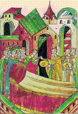 In the fall of 1440[b] Dmitry Krasny, still a young man, suddenly died in his inheritance Bezhetsky Verkh. The description of his death in the chronicle is uniquely in-depth and emotional, with many details. At first he was sick for a long time, he could not eat, lost sleep and even seemed to go deaf. On Sunday, 18 September he was able to take the sacrament, although he was bleeding from his nose and through the pores on his skin. After the sacrament, for a short time he felt better, he was able to eat a little. At night, his condition worsened, it even seemed to others that he had already died. However, he suddenly came to life and the next two days he read out loud prayers and sang psalms but talked with people around him off the mark. This delusional state ended on Wednesday, and the next day, September 22, Dmitry Krasny died. The body was brought to Moscow only on October 14, and when they opened the temporary coffin to move the body to a stone tomb, it did not show any signs of decay, "his face was white as that of a sleeping man". He was buried in the same grave with his father Yury of Zvenigorod in Cathedral of the Archangel.[17]