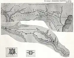 The Dnipro Line was a line of fortifications built by the Russian Empire during the Russo-Turkish War (1768–1774) stretching 180 kilometers from the Dnipro knee to the shores of the Sea of Azov along the Konka and Berda rivers. In the north, the line hinged on the Alexandrian fortress, now Zaporizhzhia, and in the south on the Saint Peter fortress near the modern city of Berdiansk. The line lost its relevance and was abandoned after the annexation of the Crimean Khanate in 1783.[1][2]