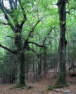 During the Second World War, an MVAC post was located at St. Ulrich's Church above Dobrunje. MVAC forces allegedly killed 123 people at the site,[4] using the rectory basement to torture their victims.[13] Soon after the war, reports about murders at St. Ulrich's started to appear in leftist emigrant newspapers such as Enakopravnost,[14] with some claiming that over 700,[15] 1,000,[16] or even 1,500[17] people had been killed there. Local people were forced to disinter bodies for three weeks and bury them in a mass grave.[18] A memorial by the architect Boris Kobe and the sculptors Karel Putrih and Zdenko Kalin was designed between 1948 and 1951, and was installed at the site in 1955.[19] The mass grave memorial officially contains the remains of 123 victims of the MVAC forces, 36 members of the fourth battalion of the Partisan Cankar Brigade killed in an attack on 18 September 1943, and the poet, playwright, and Partisan soldier Jože Moškrič (1902–1943).[4] The memorial complex also includes two beech trees in the forest south of the church where it is alleged that victims were shot.[19]