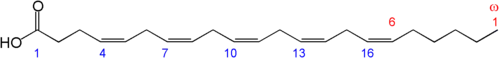 The chemical structure of clupanodonic acid showing physiological numbering (red) and chemical numbering (blue) conventions.