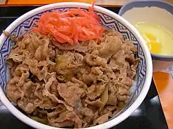 Gyūdon (牛丼; literally 'beef bowl'), is a Japanese dish consisting of a bowl of rice topped with beef and onion simmered in a mildly sweet sauce flavored with dashi (fish and seaweed stock), soy sauce and mirin (sweet rice wine). It also often includes shirataki noodles, and is sometimes topped with a raw egg or a soft poached egg (onsen tamago).
