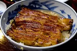 Unadon (鰻丼; an abbreviation for unagi + donburi, "eel bowl") is a dish originating in Japan. It consists of a donburi type large bowl filled with steamed white rice, and topped with fillets of eel (unagi) grilled in a style known as kabayaki, similar to teriyaki. The fillets are glazed with a sweetened soy-based sauce, called tare and caramelized, preferably over charcoal fire. The fillets are not flayed, and the grayish skin side is placed face-down. Una-don was the first type of donburi rice dish, invented in the late Edo period, during the Bunka era (1804–1818)