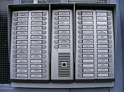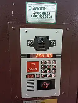A door phone or door bell phone is a set of electrical and electronic elements used to handle communication between a resident in a house, apartment or villa and a guest outside. The device can also lock or unlock the door it has been configured to work with. Door phones have been used across a variety of commercial and residential buildings. For example, offices and apartment blocks both make frequent use of door phones. They are so widely used that, nowadays, they form part of the standard electrical installation of most buildings.[1]