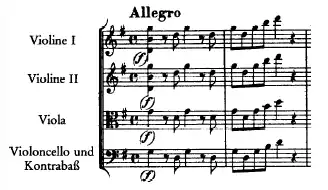 The beginning of Mozart's Eine kleine Nachtmusik (1787). The first and second violins have a triple stop notated. The low D is to be bowed only briefly and left to ring. Shortly afterwards, B and G are played normally.