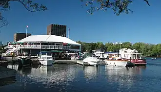 At the northern end of the lake, a pavilion housing three restaurants overlooks the water. They are Umbrella Bar, Lago and Mexi's. Other services at the pavilion include rentals of canoes, kayaks and paddle boats, boat mooring, and an indoor changing area for skating. It is open year-round.