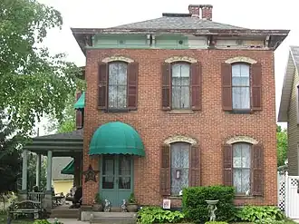 Clark had his house built in 1875; the names of the builder and designer have not been preserved. Constructed in the Italianate style,[1] it is a brick structure with a stone foundation, asphalt roof, and other elements of stone.[6] One of Mechanicsburg's numerous historic Italianate residences from the late nineteenth century,[7]: 2  it was built during the village's postwar boom; the population nearly doubled between the 1870 and 1890 censuses.[7]: 5  It is a well-preserved example of the high style of the day,[7]: 8  due to common architectural elements such as a cornice with pairs of brackets, arched windows with hood molds, and an ornamental frieze. Its floor plan takes the shape of the letter "L", although it has been modified by the addition of a side porch with miniature Ionic columns. A small wooden garage is located on the rear of the property.[5]