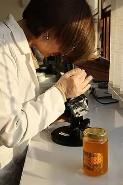 Dry matter can refer to the dry portion of animal feed. A substance in the feed, such as a nutrient or toxin, can be referred to on a dry matter basis (abbreviated DMB) to show its level in the feed (e.g., ppm). Considering nutrient levels in different feeds on a dry matter basis (rather than an as-is basis) makes a comparison easier because feeds contain different percentages of water. This also allows a comparison between the level of a given nutrient in dry matter and the level needed in an animal's diet.[10] Dry matter intake (DMI) refers to feed intake excluding its water content. The percentage of water is frequently determined by heating the feed on a paper plate in a microwave oven or using the Koster Tester to dry the feed. Ascertaining DMI can be useful for low-energy feeds with a high percentage of water in order to ensure adequate energy intake. Animals eating these kinds of feeds have been shown to consume less dry matter and food energy.[11] A problem called dry matter loss can result from heat generation, as caused by microbial respiration. It decreases the content of nonstructural carbohydrate, protein, and food energy.[12]