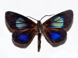 Wings of Drymoea beata can reach a length of about 33–38 millimetres (1.3–1.5 in). Upperside of the wings is deep black, with deep bright blue-green disks.[3]