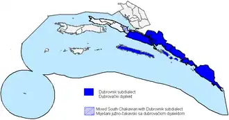 The Dubrovnik dialect (Serbo-Croatian: dubrovački dijalekt) is a Neo-Shtokavian dialect or subdialect[1] spoken in Dubrovnik and the littoral of the former Republic of Ragusa, from the eastern part of the Pelješac peninsula (around Janjina) to the Croatian border with Montenegro, and on the island of Mljet.[2]