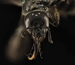Adult females measure about 7 mm in length and are black with sparse pale hairs and a strongly protuberant face. Males are 6–7 mm long, similar in color, with a longer head, lightly infuscated wings, and unmodified slender hind legs. Both sexes have smooth, shiny abdominal segments and short pale pubescence.[6]