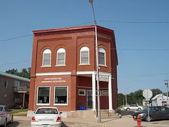 The property on which Dugan built his saloon in 1905 had previously been the Kahler General Store. The store was destroyed in a fire, and he bought the property from the Kahler family in 1902. The second floor of the 1905 building has residential space that was occupied by Dugan, his wife and daughter. He continued to own the 1895 building and he rented it to grocer Herman Lucht. Grand Mound was mostly a German community with some Irish residents as well. After the American Civil War temperance organizations gained in popularity in Clinton County, including among the Germans. In 1908 there were 92 licensed saloons in Clinton County, with 66 located in the City of Clinton alone.[2] Societal attitudes toward the consumption of alcohol were changing. An advertisement that year in the Clinton County Farmers' Institute describes Dugan's establishment as a "dealer in wines, liquors, and cigars."[2] It suggests that the saloon had become a wine room. By 1910, however, the Farmers' Institute does not mention Dugan's establishment. Farmers and Merchants Savings Bank became the tenant in the building in 1912,[3] while the Dugan family continued to live in the second floor apartment. Dugan's obituary credited him as a principal organizer of the new bank. Dugan sold all of his real estate holdings in Grand Mound to Julius Detlef, a local hardware merchant, in 1919. By that time he resided in Winnebago County, Illinois where he was a soft drink manufacturer in Rockford. The family left Rockford sometime around 1921. He died in October 1943 at a farm he owned near Davis Junction, Illinois. His daughter Theresa, who had married Frank Danielson, also resided in Davis Junction.