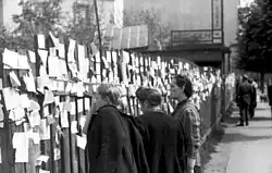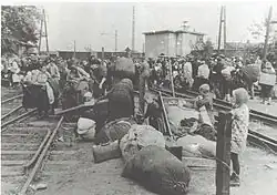 In the beginning of camps' operation, the German guards behaved very brutally.[70] At that time, sporadic incidents of Poles being murdered in the camp area occurred.[85] During this period, there were also particularly numerous transports to concentration camps. Both individuals destined for camps and those sent to forced labor were taken from Pruszków in sealed wagons. After the Wehrmacht took control of the camp, the refugees were treated more correctly, although there were still cases of prisoners being beaten. After 15 August 1944, the sealing of wagons, which were sent only under guard, was also discontinued.[70] The selections conducted by the Germans in Pruszków were, however, very brutal, and they were carried out hastily and superficially. Families were regularly separated.[13][19] During the formation of transports leaving Pruszków, the population was packed into wagons in such a crush that cases of suffocation or crushing occurred. Those unable to work were distributed in open coal wagons. Usually, the refugees embarked on a journey of several days without water and food. It was very rare for Polish personnel to manage to reach the railway siding and provide the departing ones with small supplies for the road.[95] One day, near the "green wagon", Polish workers overheard a conversation between SS men who, having dispatched a transport to the Reich without water and food, wondered aloud how many of the deported would arrive alive at their destination.[96]