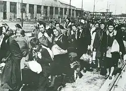 The refugees brought to the camp had to jump off the wagons amidst shouts and pushes, as there were no platforms at the Pruszków siding. Then, amidst a corridor of Germans, they were driven into one of the nine production halls. Guards were unallowed to assist the sick, injured, or elderly when disembarking from the wagons or carrying loads. Only Polish personnel recruited by the Central Welfare Council could do this, but their numbers were too few considering the size of the transports.[74] The halls where the refugees were placed were surrounded by barbed wire and supervised by German posts.[75] Leaving the halls was prohibited, so only Polish personnel could move relatively freely within the camp.[76] There were incidents where people standing too close to the fence were harassed by dogs. German agents and military patrols searched the crowd of refugees for hidden Home Army soldiers.[77]