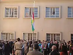 Every Saturday in this school, three students raise the Flag of Kurdistan, and the principal with the physical education teacher perform the raising of the flag, while performing the Kurdish National Anthem[2] Ey Reqîb. The picture shows the raising of the flag in 2013 and 2014.