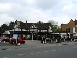 The Metropolitan Railway was extended to Uxbridge from Harrow on the Hill in 1904, passing through Eastcote. A halt was built in 1906.[9] The extension of the railway brought with it a substantial number of travellers seeking a day out in the countryside. The tea garden of the Old Barn House became popular with visitors to the area, as were cottages including The Rosery and Orchard Farm which served refreshments. In 1914, the Cavendish Pavilion was built as a private sports ground.[10] The railway halt was rebuilt as a station in 1939.[9]