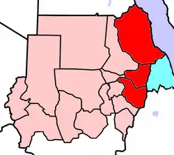 The Eastern Front (Arabic: الجبهة الشرقية, romanized: al-Jabhah al-Sharqīyah) was a coalition of rebel groups operating in eastern Sudan along the border with Eritrea, particularly the states of Red Sea and Kassala. The Eastern Front's Chairman is Musa Mohamed Ahmed. While the Sudan People's Liberation Army (SPLA) was the primary member of the Eastern Front, the SPLA was obliged to leave by the January 2005 Comprehensive Peace Agreement that ended the Second Sudanese Civil War. Their place was taken in February 2004 after the merger of the larger Beja Congress with the smaller Rashaida Free Lions, two tribal based groups of the Beja and Rashaida people, respectively.[1] The Justice and Equality Movement (JEM), a rebel group from Darfur in the west, then joined.