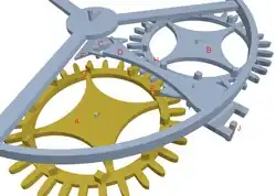 Breguet realised that this problem (more serious at the time because of the rather poorer oils then available) could be removed and many of the advantages of the detent escapement retained if an impulse were given in both directions of the balance. In order to do this he geared two escape wheels together, one escape wheel driven by the fourth wheel of the wheel train, which in turn was geared to and drives a second escape wheel. A pivoted detent swings freely between them and locks each escape wheel in turn on a coaxial set of locking teeth.