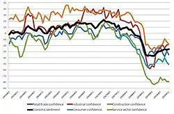 Lithuania was the last among the Baltic states to be hit by recession because its GDP growth rate in 2008 was still positive, followed by a slump of more than 15% in 2009. In the third quarter of 2009, compared to the previous quarter, GDP again grew by 6.1% after five-quarters with negative numbers.[43] Austerity policy (four-fifths of the fiscal adjustment consisted of expenditure cuts)[79] introduced by the Kubilius government helped to balance the current account from −15.5 in 2007 to 1.6 in 2009.[80] Economic sentiment and confidence of all business activities have rebounded from a record low at the beginning of the year 2009.