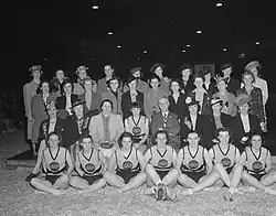 In 1940, the Royal Canadian Air Force took over the Edmonton Arena for wartime use,[20] depriving the Grads of a local space in which to play against international teams. The commencement of World War II disrupted regular basketball competition throughout Europe and beyond, causing the cancellation of tournaments and championships and making it increasingly difficult for sports teams to travel. [21] Additionally, despite Page's continuous efforts to find suitable competition over the years,[22] no team had ever proven themselves consistently good enough to be a clear rival for the Grads. The Grads' dominance in basketball no longer attracted the same attention it had before, and regular game attendance had been shrinking.[23]