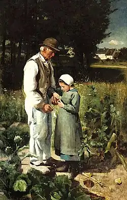 Many Victorians possessed a somewhat sentimentalised view of childhood and genre paintings of children such as those produced by William Henry Gore and Blanche Jenkins amongst numerous others were immensely popular.[26] Stott had commercial and international critical success with a number of his paintings depicting children at play. They possess a tenderness that suggests an affinity with children. The Old Gate (1895) was chosen for a major art exhibition in Munich. It shows a boy and a team of plough horses returning home on a late summer's evening where they are welcomed by two young girls bathed in the shadows of a late evening sun. Stott presents a painting in tune with the sensibilities of his audience that rural life was stable and permanent and built on rituals of hard work. The painting which is now owned by the Manchester Art Gallery was subsequently shown at the Brussels Exposition in 1897 and at the Paris Exposition Universelle in 1900, possibly at the request of Stott's friend and patron Isidore Spielmann.[3]