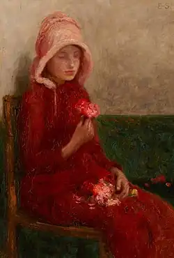 In 1880 Stott determined to become a full-time artist and with the support of an unknown benefactor he moved to Paris and to the atelier of Charles August Carolus- Duran.[4] This was a well-trodden path used by some British and Irish art students of the period. It was often seen as a staging post into the prestigious École Nationale Supérieure des Beaux-Arts at which Stott studied under Alexandre Cabanel. Although Cabanel generally painted classical and religious subjects in an academic style, which were dismissed derisively as L'art pompier (literally 'Fireman art') by some critics,[5] he was a portrait painter of skill with a deep knowledge of French art of the nineteenth century.[6] Stott was thus exposed to influences such as Realism as typified by Jules Bastien Lepage, the impressionists, and the earlier influences of the Barbizon School and in particular Corot and Millet, from whom Stott incorporates some of the prominent features in the use of colour, softness of form and in tonal qualities.[7] During his period of training in Paris, Stott exhibited four paintings at Paris Salon: The Helping Hand of a Small Friend, (1882) and Solitude (1883) exhibited in 1883 whilst The High Grasses (1883) and The Return to the Poultry House (1884) were shown the following year.[note 3][3] What became evident at an early stage in Stott's development was his preference for rural themes and a penchant for the domestic depiction of rural life and of children. The use of green in differing tonal shades is predominant in The Helping Hand of a Small Friend and reminiscent of the atelier of Carolus Duran whilst The High Grasses possesses a softer, more tonal application. In terms of subject matter there is a strong influence of the naturalism of Bastien-Lepage. A necessary component of an art student in Paris' experience was to spend time in une colonie artistique (an artists' colony) away from the city in a setting where ideas were discussed and alliances were made. Edward Stott opted for Auvers-sur-Oise, northeast of Paris, a rural habitué visited in the past by many artists from Corot to Van Gogh who is buried in the Auvers-sur-Oise municipal cemetery.[8]