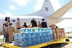 The entirety of Puerto Rico was declared a Federal Disaster Zone shortly after the hurricane.[69] The Federal Emergency Management Agency planned to open an air bridge with three to four aircraft carrying essential supplies to the island daily starting on September 22.[32] Beyond flights involving the relief effort, limited commercial traffic resumed at Luis Muñoz Marín International Airport on September 22 under primitive conditions. A dozen commercial flights operated daily as of September 26.[80] By October 3, there were 39 commercial flights per day from all Puerto Rican airports, about a quarter of the normal number.[81] The next day, airports were reported to be operating at normal capacity.[82] In marked contrast to the initial relief efforts for Hurricane Katrina and the 2010 Haiti earthquake, on September 22, the only signs of relief efforts were beleaguered Puerto Rican government employees.[83] The territory's government contracted 56 small companies to assist in restoring power.[69] Eight FEMA Urban Search & Rescue (US&R) teams were deployed to assist in rescue efforts.[84]