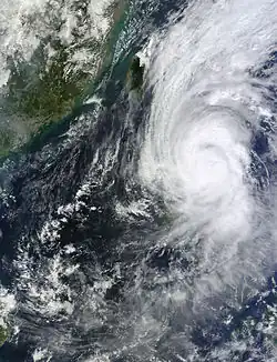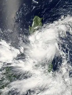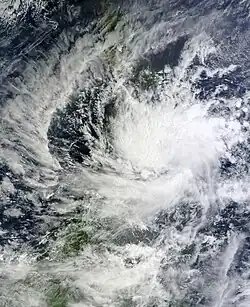 Late on November 10, as Zoraida moved into the Philippine area of responsibility, PAGASA issued the Public Storm Warning Signal Number 1 for seven areas in Mindanao, indicating the potential for winds between 30–60 km/h (20–35 mph).[108] Over the next day these warnings were extended to cover three provinces in Luzon, eight provinces in Visayas and twenty-one provinces in Mindanao.[109] On Cebu Island, officials ordered schools to close during the storm's passage.[110] After the extreme damage due to Typhoon Haiyan in the Philippines, the depression that became Podul affected the same areas just days later, which affected rescue work.[111] The depression caused additional difficulties in travel and communications.[112] In addition to causing a landslide in Monkayo,[113] flooding from the depression covered roads and forced about 1,000 families to evacuate.[114] In Davao del Norte, the depression resulted in river flooding that killed two people.[115] Zoraida later moved out of their area of responsibility on November 12, when it intensified into Tropical Storm Podul two days later.