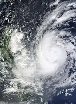 During October 9, PAGASA issued Public Storm Warning Signal #1 for the island province of Catanduanes, before expanding the areas under Signal 1 early the next day to include Aurora, Camarines Norte, Camarines Sur, Isabela, the Polillo Islands and Quezon due to the incoming and intensifying Typhoon Nari, or Typhoon Santi.[69][70][71] Later that day after the system had intensified into a typhoon and accelerated slightly towards the Philippines slightly, PAGASA placed 17 areas in Luzon under Signal #1, 14 areas under Signal #2 and Aurora Province under Signal #3.[72] During October 11, the areas under signal 3 were expanded to include Benguet, Ifugao, Ilocos Sur, Isabela, La Union, Pangasinan, Polillo Island, Quirino, Nueva Ecija and Tarlac.[73] Over the next day, the warnings were gradually revised before they were all subsequently cancelled during October 12, as the system moved out of the Philippine Area of Responsibility and was moving towards Vietnam.[74][75] Within the Philippines a total of 15 people were left dead while 5 were missing from Typhoon Nari.[68][76]