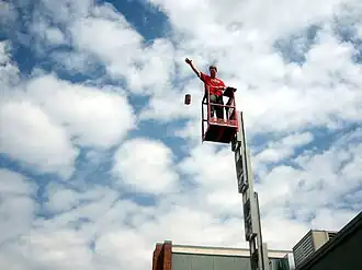 Another common variation is the egg hurl competition, where the containers are thrown by a device such as a trebuchet or air cannon. This variation is often used by schools that lack tall places from which to drop the containers.[3][4] The egg hurl variation adds additional difficulties to the design of the container, since it is initially hurled at high speed and has to cope with horizontal as well as vertical velocities upon landing.