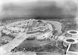 There is a single source that claims that Egmond Castle was destroyed in 1315. If such were true, the circular castle would have been destroyed that year.[8] Renaud thought it more likely that this happened during the rebellions after the death of Count Floris V.[9] In both cases a wall fragment retrieved in the northwest moat could be a leftover of the destruction.[8] The distance between the round castle, and the new (third) castle makes it likely that the round castle lost its use in about 1300.[9] The existence of the circular water castle was then forgotten till it was rediscovered in the 1930s.[10] See: 18th century floor plan.