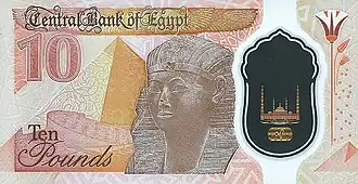 All Egyptian banknotes are bilingual, with Arabic texts and Eastern Arabic numerals on the obverse, and English texts and Western Arabic numerals on the reverse. Obverse designs tend to feature an Islamic building with reverse designs featuring Ancient Egyptian motifs (buildings, statues and inscriptions). During December 2006, it was mentioned in articles in Al Ahram and Al Akhbar newspapers that there were plans to introduce £200 and £500 notes. As of 2024, there are £200 notes circulating but there are still no plans for issuing £500 notes.[14] Starting from 2011 the 25 PT, 50 PT and £1 banknotes were phased out in favour of more extensive use of coins. However, as of June 2016 the National Bank of Egypt reintroduced the £1 banknote into circulation[15] as well as 25 PT and 50 PT notes in response to a shortage of small change.