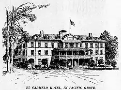 El Carmelo Hotel was Pacific Grove's first hotel, opened to guests on May 20, 1887. It was sometimes called the sister of the Hotel Del Monte. It was located on Lighthouse Avenue between Fountain and Grand Avenues, Pacific Grove and owned by the Pacific Improvement Company (PIC). In 1907, the name of the hotel changed to the Pacific Grove Hotel. In 1917, the PIC decided to dismantle it and use the wood in the reconstruction of The Lodge at Pebble Beach, California that had burned down on December 17, 1917. The empty block was sold to W. R. Holman in 1919 to open the Holman Department Store.[1]