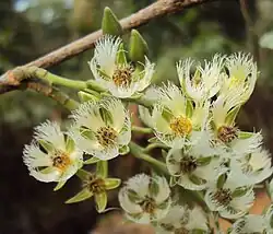 Elaeocarpus serratus, the Ceylon olive, is a tropical flowering plant in the family Elaeocarpaceae. It is a medium to large tree, with white flowers. It has a disjunctive distribution, with the species occurring in Sri Lanka and southern India, and in Assam, Bangladesh and other parts in the north of the Indian subcontinent. The fruit is commonly eaten, and people also use the plant for ornamental, religious and folk-medicinal purposes. There are historical records of traditional-medicine use of the plant. Paradoxurus jerdoni (Brown palm civet) consumes parts of the tree.