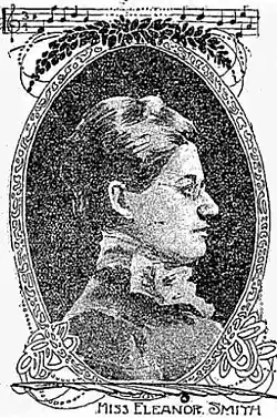Born in Atlanta, Illinois in 1858, Eleanor was the daughter of Willard Newton and Matilda (Jaspersen) Smith.[1][2] She came from a musical family, as her father was a noted bass in the First Presbyterian Church Choir in Chicago between 1860 and 1871.[3] In an interview she gave in 1908, Smith claimed that both sides of her family were musical, noting that a paternal great-grandfather composed hymns and that her maternal line was a musical mix of Danish, French, German, and Jewish ancestry.[4] Smith taught herself to play the piano and did not begin any formal training for voice or composition until she was eighteen years old. She had very poor vision, which limited her ability to use her eyes for long periods of time.[5] She studied at the Hershey School of Musical Art and published her first cantata, "The Golden Asp", while still a student there.[4] She later graduated from Cook County Normal School, but continued to study music privately as a pupil of Frances A. Root (voice) and Frederick Grant Gleason (composition).[1][2]