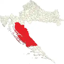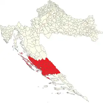- Northern part of Split-Dalmatia County including cities and municipalities: Dicmo, Dugopolje, Hrvace, Kaštela, Klis, Lećevica, Marina, Muć, Okrug, Otok, Prgomet, Primorski Dolac, Seget, Sinj, Trilj, Trogir, Vrlika.
