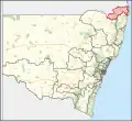The electoral district includes all of the City of Lismore (including Lismore, Lindendale, Nimbin, Dunoon and Clunes), much of inland Tweed Shire (including Murwillumbah, Tyalgum and Uki), all of Kyogle Council (including Kyogle, Bonalbo, Tabulam and Woodenbong) and all of Tenterfield Shire.[1] (including Tenterfield, Drake, Jennings, Liston, Legume, Torrington and Urbenville)