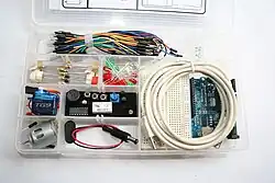 An electronic kit is a package of electrical components used to build an electronic device. Generally, kits are composed of electronic components, a circuit diagram (schematic), assembly instructions, and often a printed circuit board (PCB) or another type of prototyping board.