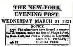 Anson Green Phelps was born in 1781 and served an apprenticeship in the saddler's trade in Hartford, Connecticut. He found a market for his leather goods in South Carolina and expanded his business by shipping cotton from there to New York. The cotton was then sold to England and in return Phelps imported manufactured goods for sale in America. He also started to run a small shipping company and moved his business from Hartford to New York, where he formed a partnership in 1821 with Peck. In America the partnership was called Phelps & Peck, located at 179/181 Front Street, and in Britain it was called Peck & Phelps, operating from Liverpool. The company imported metals but also diversified, selling such things as furs, feathers, and tobacco. They distributed goods along the Atlantic seaboard using their coasters, and peddlers took their wares to sell at inland settlements. The opening of the Erie Canal in 1825 and the rapidly expanding West also provided an unlimited market for their manufactured goods. Between 1821 and 1824 their annual average profit was approaching forty thousand dollars.[6]