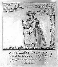 Women were enlisted by the court to search for the witch's mark, and claimed to have found it near Sawyer's anus.[2] This evidently had a strong effect in swinging the jury to conviction. She was judged guilty and hanged for witchcraft in 1621. No records of the trial survive.