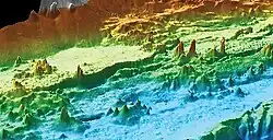 The Endeavour section of the Juan de Fuca Ridge is approximately 90 km long and spreads at 6 cm per year.[7] Along the ridge, there are six major vent fields (including Stockwork) and over 800 individual chimneys have been recorded over a 15 kilometres (9.3 mi) section of the ridge.[8] Other vent fields of this section include High Rise, Mothra, Salty Dawg, Sasquatch, and Stockwork. All sites are basalt-hosted.