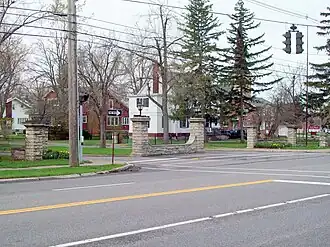 Entranceway at Main Street at High Park Boulevard is a suburban residential subdivision entranceway built about 1916 by developer Charles S. Burkhardt. It is located on Main Street (New York State Route 5) at Eggertsville in the town of Amherst within Erie County. It consists of tall and short stone posts, corresponding quarter-height stone walls, and accent light fixtures set on either side of the streets' intersecting corners.[2]