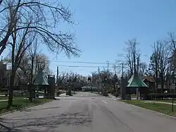 Entranceways at Main Street at Lamarck Drive and Smallwood Drive are a set of complementary residential subdivision stone entranceways built in 1926. They are located on Main Street (New York State Route 5) in the hamlet of Snyder, New York within the town of Amherst, which is located in Erie County.[2] These entranceways are markers representing the American suburbanization of rural areas through land development associated with transportation on the edges of urban developments.[3] The Smallwood entranceway is a pair of symmetric groupings of stone gatehouses and posts flanking the two sides of the drive at Main Street. The Lamarck entranceway is a pair of Y-shaped and U-shaped stone half-walls flanking the two sides of the drive at Main Street. The entranceways were added to the National Register of Historic Places on December 7, 2005.