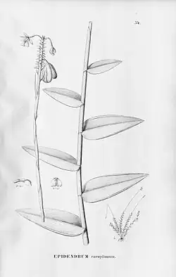 E. orchidiflorum grows in sandy thickets in Bahia, Brazil, according to Reichenbach's[1] reading of Salzmann, and flowers in February, growing in sandy bushy places near Macero, according to Reichenbach's reading of Gardner, 1421. The flat, coriaceous distichous leaves are ovate-oblong and obtuse. The stout, ~3 dm long, terminal peduncle is covered with rough imbricate sheathes and ends in a short raceme of green flowers. The dorsal sepal is obovate, and the lateral sepals are oblong. The two petals are linear-subcuneate. The subrotund lip has two calli at the base, and is tridentate at the apex; the middle tooth is smaller than the lateral teeth.